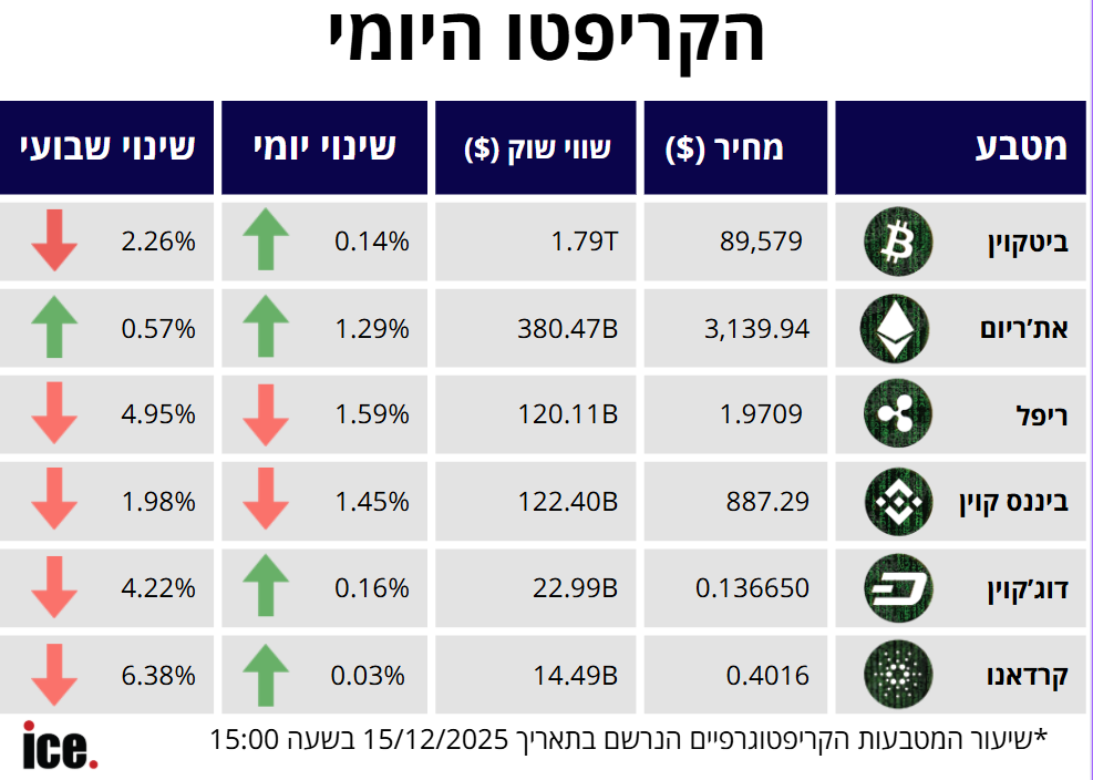 שוק הקריפטו חווה מגמה חיובית בעיקרה, זאת מלבד מטבעות הריפל והביננס קוין. הביטקוין גדל ב-0.13%, שווי השוק שלו עומד על 1.79 טריליון דולר והוא נסחר במחיר של 89,579 דולר