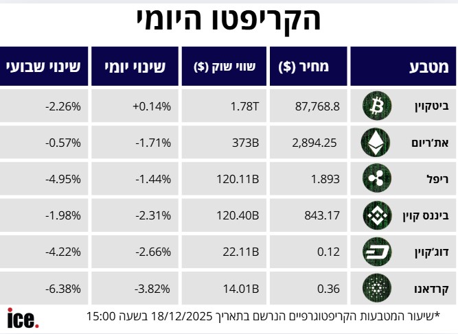 שוק מטבעות הקריפטו ממשיך במגמת הירידה שלו מהתקופה האחרונה, כאשר גם היום (חמישי) רובם המוחץ של המטבעות בוק רשמו ירידות. מי שדווקא רשם עלייה בדמות 0.14% הוא הביטקוין, המטבע החזק ביותר בשוק, שמחירו עומד כעת על 87,768.8 דולר ושווי השוק שלו הוא 1.78 טריליון דולר.