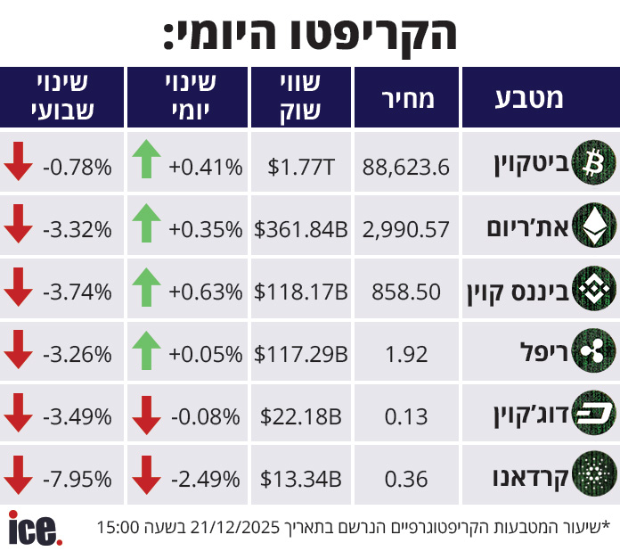 שוק מטבעות הקריפטו ממשיך את את התקופה החיובית שלו כאשר מרבית המטבעות המרכזיים רשמו עלייה יומית. מטבע הביטקוין ממשיך להיות המטבע הכי חזק בשוק כאשר הוא רושם עלייה יומית של 0.41%, ומחירו עומד על 88,623.6 כאשר שווי השוק שלו עומד על 1.77 טריליון דולר.