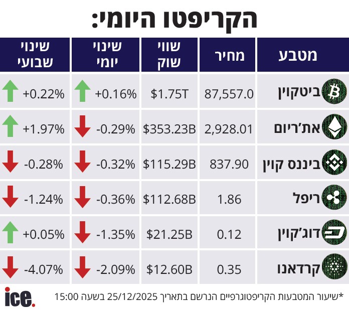 המטבע השני הכי חזק בשוק, האת'ריום, ירד ב-0.29%, כאשר מחירו עומד כעת על 2,928.01 דולר ושווי השוק שלו הוא 353.25 מיליארד דולר. אחריו הביננס קוין, שרשם גם הוא ירידה של 0.32%. כעת, מחירו של הביננס עומד על 837.90 דולר ושווי השוק שלו הוא 115.29 מיליארד דולר.