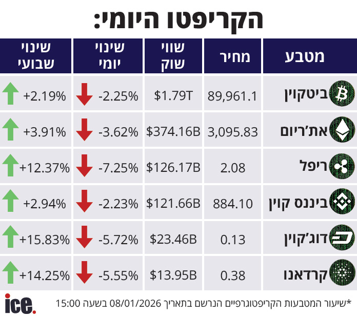 שוק מטבעות הקריפטו ממשיך במגמה השלילית שלו מאתמול עם ירידות בכלל המטבעות המסוקרים. מטבע הביטקוין, הלוא הוא המטבע הכי חזק בשוק, רושם שינוי יומי עם ירידה של 1.85%- למחיר של 89,961.1 וכעת שווי השוק שלו עומד על 1.79 טריליון דולר.