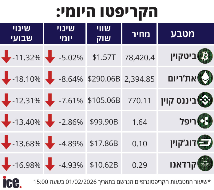 שוק מטבעות הקריפטו ממשיך בצניחה החופשית: הביטקוין מתרסק ביותר מ-5% ומחירו נסחר כבר על 78,420.4 דולר. האת'ריום רושם את הירידה החדה ביותר, הביננס קוין מתרסק. ומי ירד הכי פחות מכולם?