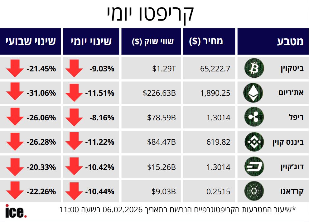 שוק מטבעות הקריפטו ממשיך היום (שישי) במגמת ההתרסקות שלו. מטבע הביטקוין הוא הוא המטבע החזק בשוק, רושם שינוי יומי בו הוא מציג ירידה של 9.03%- למחיר של 65,222.7 וכעת שווי השוק שלו עומד על $1.29T.