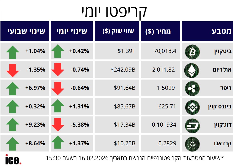שוק הקריפטו חווה מגמה מעורבת, זאת כאשר הביטקוין עלה ב-0.42% ומחירו מסתכם ב-70,018.4 דולר. המטבעות הדיגיטליים את'ריום, ריפל ודוג'קוין הציגו שינויים שליליים ובכך אכזבו משקיעים רבים | הקריפטו היומי