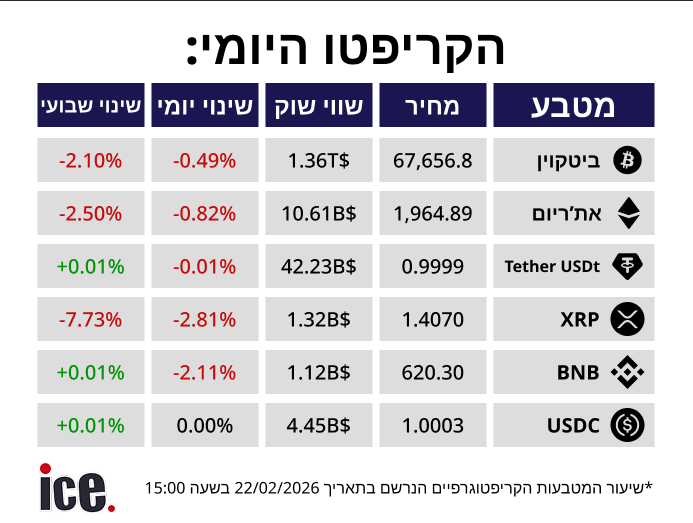 מטבע הריפל רושם את השינוי היומי השלישי ביותר והוא יורד ב-2.81%- למחיר של 1.4070 וכעת שווי השוק שלו עומד על 1.32 מיליארד דולר. מבטע הביננס קוין רושם שינוי יומי עם ירידה של 2.11%- למחיר של 620.30 וכעת שווי השוק שלו עומד על 1.12 מיליארד דולר. מטבע ה-usdc עומד על 0.00% כשמחירו על 1.0003 ושווי השוק שלו 4.45 מיליארד דולר.