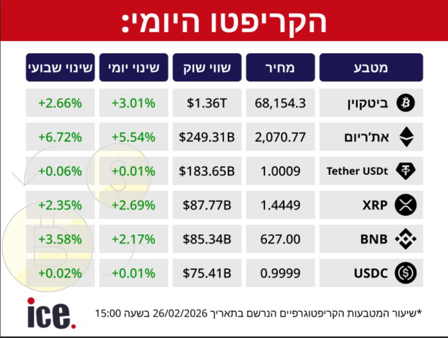 שוק מטבעות הקריפטו חווה מגמה חיובית, זאת כאשר הביטקוין גדל ב-3.41%, שווי השוק שלו מסתכם ב-1.34 טריליון דולר והוא נסחר במחיר של 66,950.4 דולר. המטבע הדיגיטלי שהציג את השינוי החיובי הגבוה ביותר הוא האת'ריום