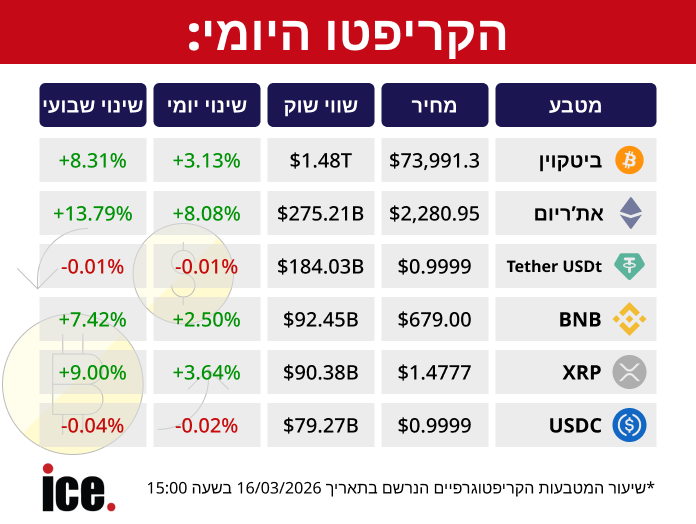 שוק הקריפטו חווה מגמה חיובית בעיקרה, זאת כאשר הביטקוין עלה ב-3.13% ושווי השוק שלו עומד על 1.48 טריליון דולר. המטבעות Tether ו-USDC היו היחידים שהציגו שינויים שליליים
