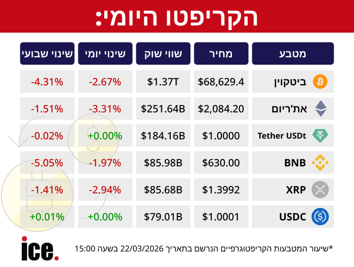 שוק המטבעות הקריפטוגרפיים רושם היום מגמה חצויה מבין המטבעות המסוקרים. הביטקוין, הלוא הוא המטבע החזק בשוק, רושם שינוי יומי בו הוא הציג שינוי יומי שלילי עם ירידה של 2.67%- למחיר של 68,629.4 וכעת שווי השוק שלו עומד על 1.37 טריליון דולר.
