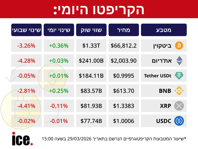 מנתוני שיעור המטבעות הקריפטוגרפיים שנרשמו היום (29/03/2026) נכון לשעה 15:00, עולה תמונה של התאוששות יומית קלה בקרב המטבעות המובילים, על אף ירידות שערים בסיכום השבועי.