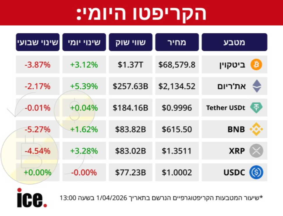 נכון לשעה 13:00 (1.4.2026), שוק הקריפטו מציג סימני התאוששות מעודדים, כאשר רוב המטבעות המרכזיים נסחרים בעליות המנסות למחוק את ההפסדים מהשבוע האחרון.