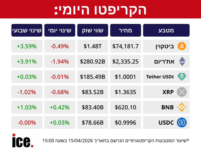 הביטקוין איבד מערכו, 0.49% ומחירו עומד על 74,181.7 דולר ולמרות זאת, בסיכום השבועי ערכו של המטבע המוביל זינק בכמעט 4% | הדירוג המלא כאן