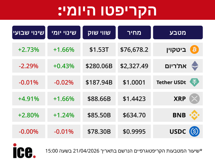 שוק הקריפטו חווה מגמה חיובית בעיקרה, זאת כאשר הביטקוין גדל ב-1.66%, שווי השוק שלו עומד על 1.53 טריליון דולר והוא נסחר במחיר של 76,678.2 דולר. מטבעות ה-Tether וה-USDC הציגו שינויים שליליים
