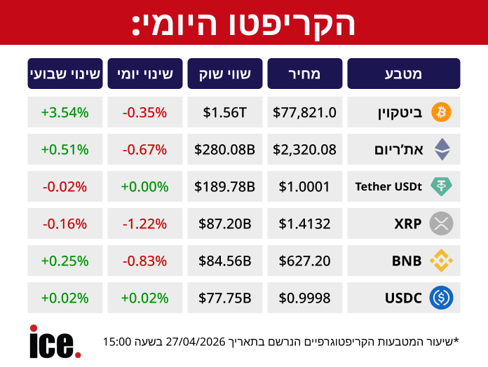 שוק מטבעות הקריפטו רושם מגמה שלילית זאת לאחר שרוב המטבעות המסוקרים - אדומים. מטבע הביטקוין הלוא הוא המטבע הכי חזק בשוק, רושם שינוי יומי עם ירידה של 0.35%- למחיר של 77,821.0 וכעת שווי השוק שלו עומד על 1.56 טריליון דולר.