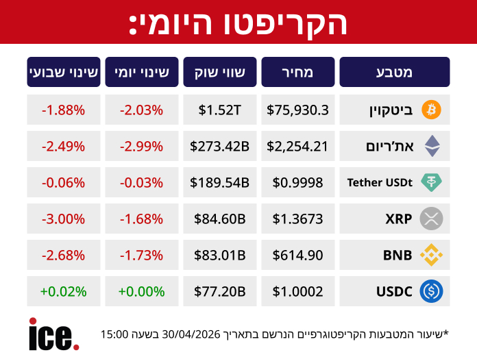 מגמה שלילית בשוק הקריפטו: מטבע הביטקוין הציג ירידה של 2.03%, זאת כאשר שווי השוק שלו מסתכם ב-1.52 טריליון דולר ומחירו הינו 75,930.3 דולר | כל הפרטים