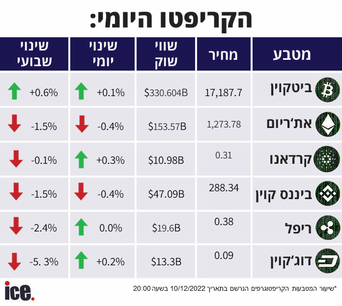 ביטקוין עולה היום בשיערו של 0.1% ומחירו עומד על 17,187 דולר למטבע. הנתונים האלה מצטרפים לשבוע החיובי-חלש האחרון של המטבע כאשר רשם עליה שבועית של 0.6% בלבד. שווי השוק של הביטקוין עומד כעת על 330.6 מיליארד דולר.
