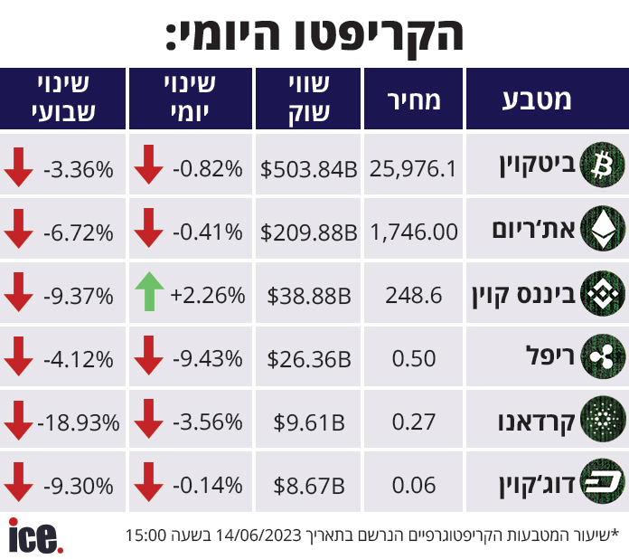 מדדים אדומים בקריפטו היומי: המטבע החזק, הביטקוין ירד ב-0.82% וערכו עומד כעת 25,976.1 עם שווי שוק של 503.84 מיליארד דולר.