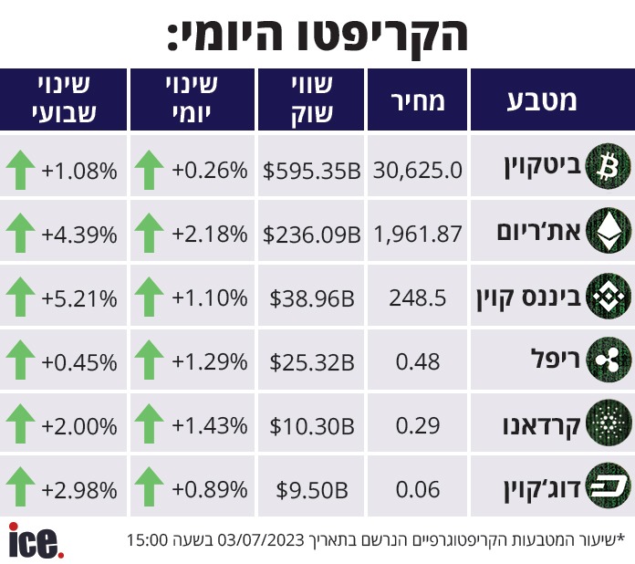 אחרי מספר ימים של מגמות מעורבות, שוק הקריפטו חזר להראות ביצועים חיוביים, עם עליות בקרב כל המטבעות המובילים. הביטקוין, המטבע המוביל בשוק, רשם היום עלייה של 0.26% למחיר של 30,625 דולר ליחידה ושווי שוק של 595.35 מיליארד דולר. בשבוע האחרון עלה הביטקוין ב-1.08%.