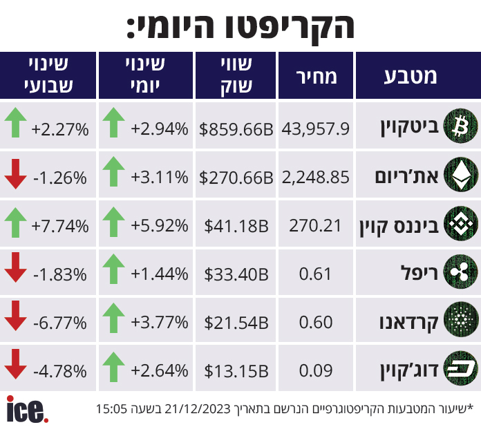 לאחר ימים של תנודתיות ניכרת בשוק, וירידת שערים שהגיע לאחר עלייה ניכרת, נרשמו עליות שערים חוזרות בכל המטבעות הקריפטוגרפיים הגדולים. היום (חמישי) הטבלה נצבעה בירוק, כאשר כל המטבעות הגדולים רושמים עלייה בשיעורים ניכרים. המטבע המוביל את שוק הקריפטו, הביטקוין, רושם עלייה נאה, בסימן השתקמות מהדשדוש שנרשם אמש ומחירו נסחר כעת ב-43,957.9 דולר.