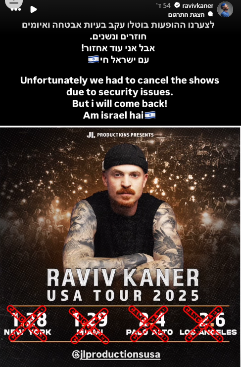 "לצערנו ההופעות בוטלו עקב בעיות אבטחה ואיומים חוזרים ונשנים. אבל אני עוד אחזור. עם ישראל חי". כתב רביב כנר בסטורי שפרסם לפני זמן קצר בחשבון האינסטגרם שלו, שאחריו עוקבים כ-76 אלף אנשים.