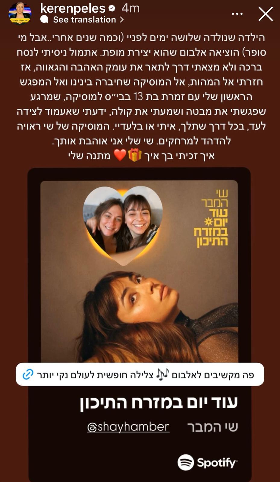 בסטורי שפרסמה בחשבון האינסטגרם שלה, פרגנה קרן פלס לזמרת הצעירה שי אמבר (27) על האלבום החדש שהוציאה הנקרא "עוד יום במזרח התיכון". נזכיר, שי אמבר, התפרסמה במהלך תוכנית הטלוויזיה "בית הספר למוסיקה", שם שימשה קרן פלס כשופטת וכמורה שמלווה את התלמידים הצעירים בתהליך המאתגר עד לזכייה בפרס היוקרתי. באותה תוכנית, בחרה קרן פלס בשי אמבר, אז זמרת צעירה בת 13, והתחייבה להכשיר אותה להגיש שירים בצורה מקצועית בנוכחות קהל.