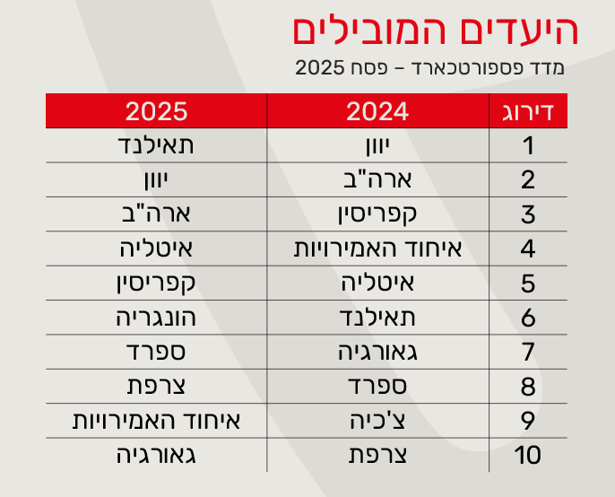 מדד פספורטכארד, מצביע על יעד מפתיע שתופס את הפסגה. בנוסף, לראשונה מאז תחילת המלחמה, צפויים לצאת לחו"ל יותר ישראלים מאשר בתקופה המקבילה טרם המלחמה