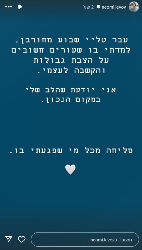 בסטורי שפרסמה היום (ראשון) בחשבון האינסטגרם שלה, כתבה השחקנית: "עבר עליי שבוע מחורבן. למדתי בו שעורים חשובים על הצבת גבולות והקשבה לעצמי. אני יודעת שהלב שלי במקום הנכון. סליחה מכל מי שפגעתי בו".