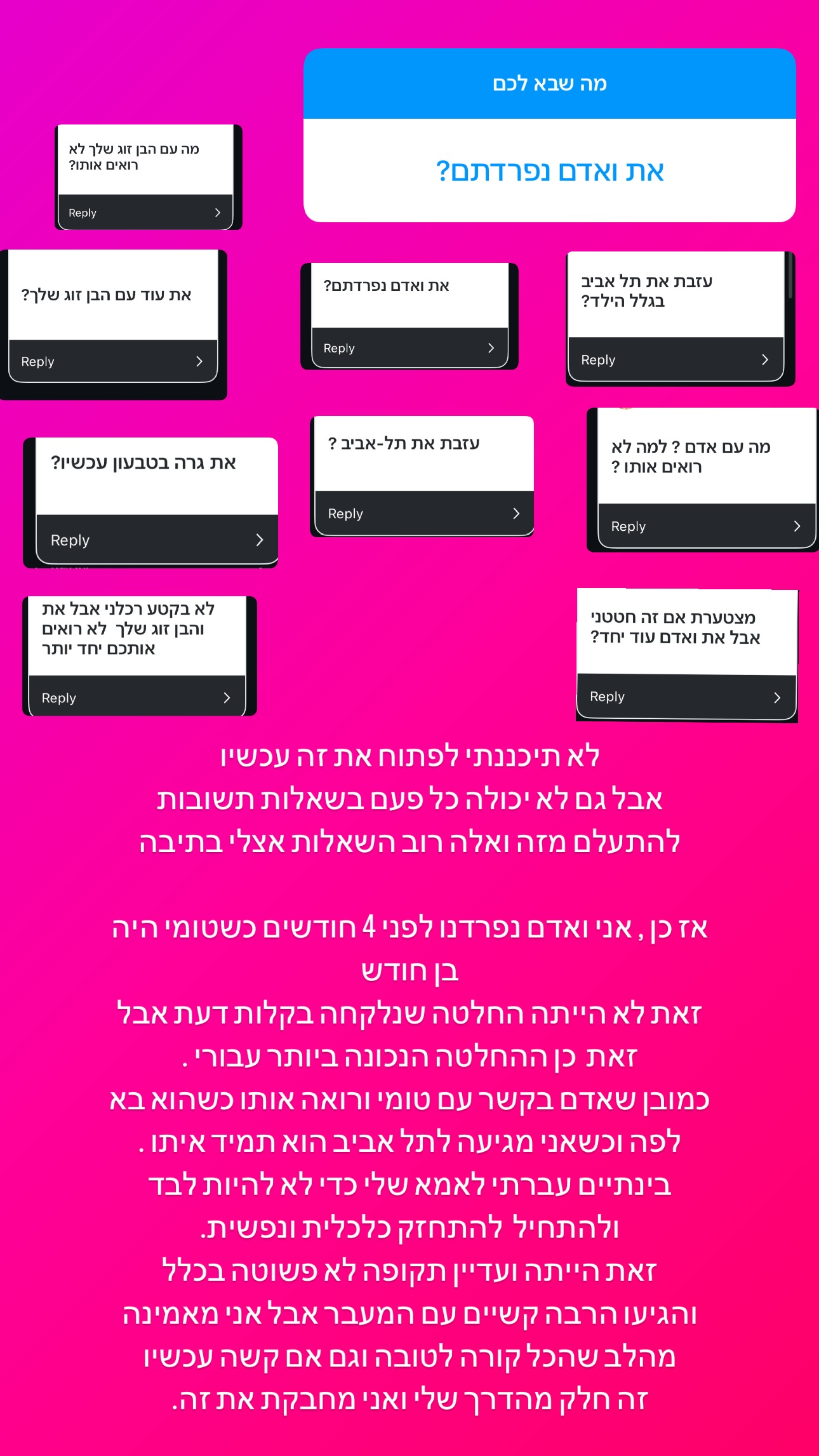 שיתפה ביחסים בין שניהם לאחר הפרידה הכואבת: "כמובן שאדם בקשר עם טומי ורואה אותו כשהוא לפה וכשאני מגיעה לתל אביב הוא תמיד איתו". סיפרה על מצבה בימים אלו: "בינתיים עברתי לאמא שלי כדי לא להיות לבד ולהתחיל להתחזק כלכלית ונפשית".