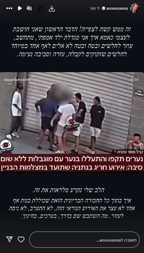 סרטון מצמרר שהופץ ברשתות החברתיות, מראה כיצד קבוצת נערים תקפה והתעללה בנער בעל מוגבלות. אנה ארונוב הביעה את כאבה נוכח האלימות שהופעלה כלפי הנער: "איך אף אחד לא עצר את האירוע הנוראי הזה?"