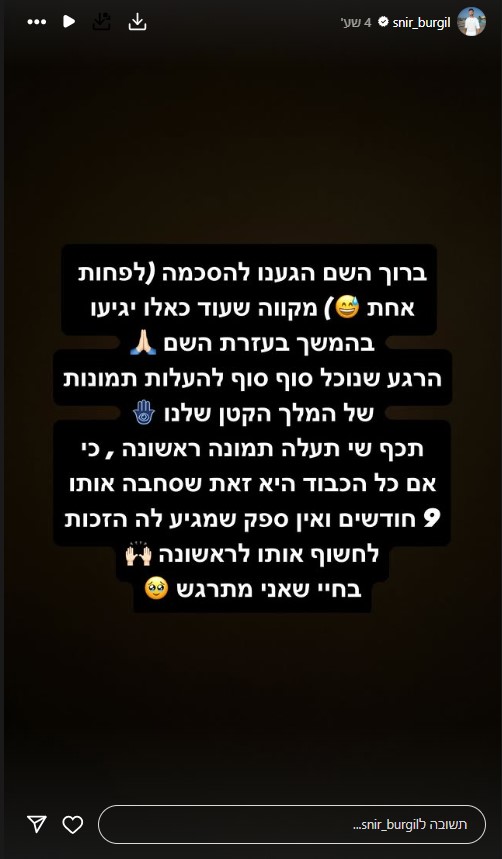 רגע לפני פרסום הפוסט, דאג שניר בורגיל דאג לעדכן על כך את עוקביו: "ברוך השם הגענו להסכמה (לפחות אחת). אני מקווה שעוד כאלו יגיעו בהמשך בעזרת השם. הרגע שנוכל סוף סוף להעלות תמונות של המלך הקטן שלנו".