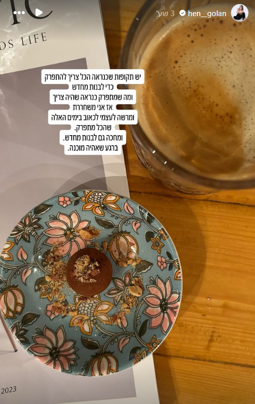 היא הוסיפה: "מרשה לעצמי לכאוב בימים האלה שהכל מתפרק, ומחכה גם לבנות מחדש - ברגע שאהיה מוכנה". גולן כזכור, שודכה בתכנית לברק מור, קשר שלא החזיק מעמד והשניים החליטו להיפרד.