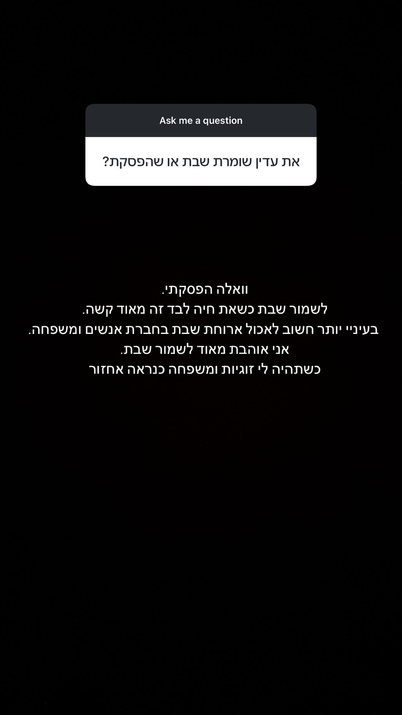 "את עדיין שומרת שבת או שהפסקת?", נשאלה אברהמי על ידי אחד העוקבים שלה ברשת החברתית הפופולרית. זוכת "המירוץ למיליון" השיבה לשאלה וכתבה: "וואלה, הפסקתי. לשמור שבת כשאת חיה לבד זה מאוד קשה. בעיניי, יותר חשוב לאכול ארוחת שבת בחברת אנשים ומשפחה. אני אוהבת מאוד לשמור שבת. כשתהיה לי זוגיות ומשפחה כנראה אחזור".