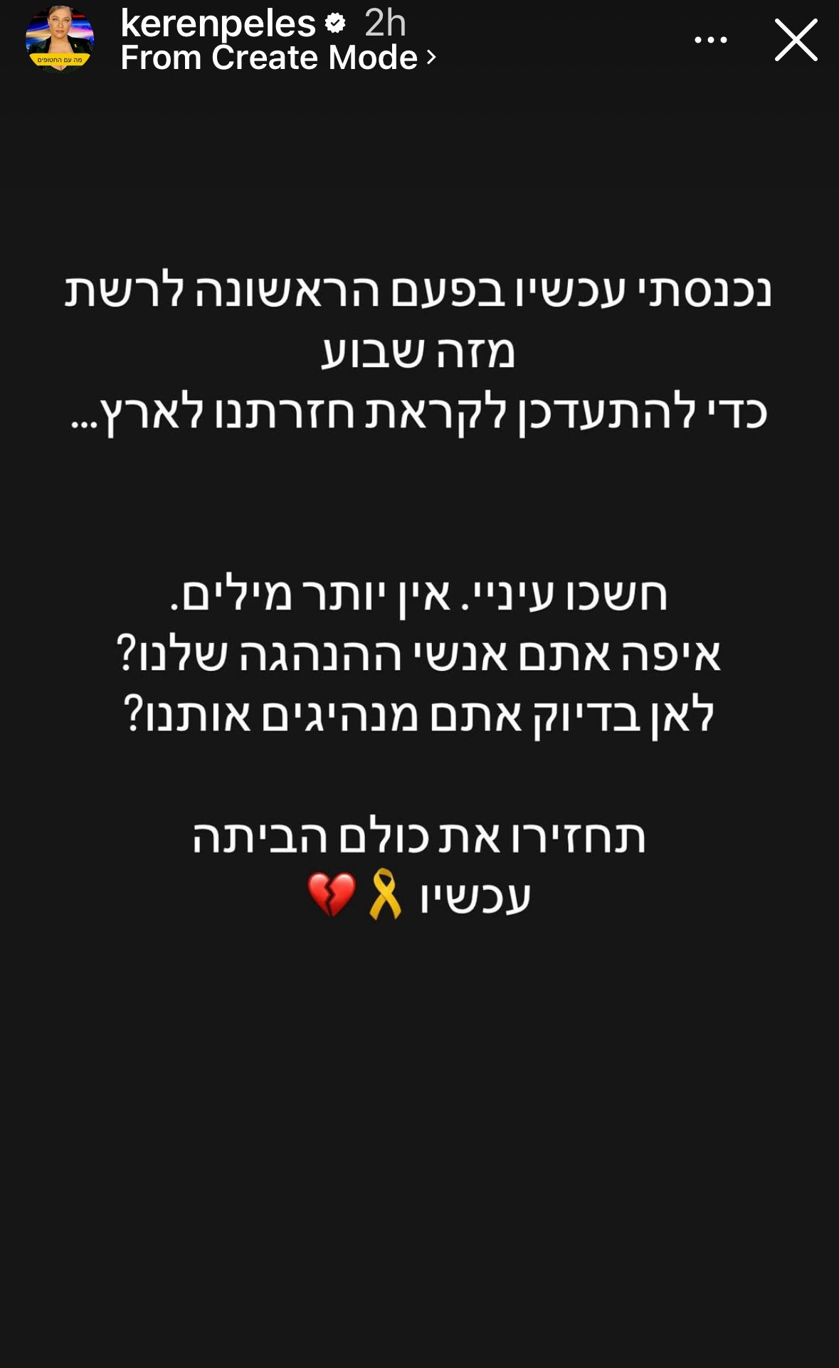 בסטורי שפרסמה בחשבון האינסטגרם שלה, כתבה פלס: "נכנסתי עכשיו בפעם הראשונה לרשת מזה שבוע כדי להתעדכן לקראת חזרתנו לארץ. חשכו עיניי, אין יותר מילים. איפה אתם אנשי ההנהגה שלנו? לאן בדיוק אתם מנהיגים אותנו? תחזירו את כולם הביתה, עכשיו".