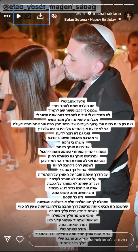 כוכבת הילדים ברכה את חברה הטוב לרגל יום הולדתו שחל היום. בסטורי שהיא פרסמה בחשבון האינסטגרם שלה, כתבה מיכל הקטנה: "אלעד אהוב שלי, יום הולדת שמח לאחד והיחיד שנכנס לי ללב ונשאר שם לתמיד.