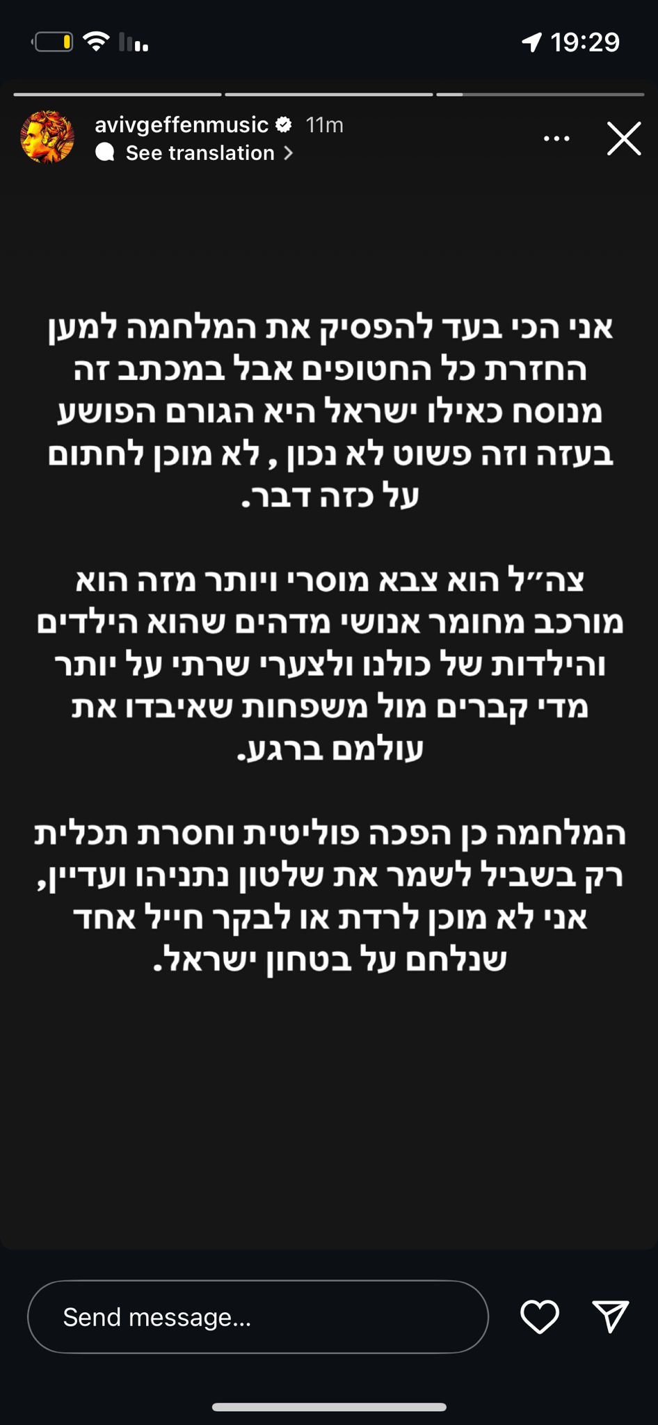 הזמר והיוצר אביב גפן יוצא נגד מכתב האמנים שחתמו על הצהרה לסיום המלחמה ברצועת עזה ותוקף בסטורי שהעלה בעמוד שלו באינסטגרם: "אני הכי בעד להפסיק את המלחמה למען החזרת כל החטופים, אבל במכתב זה מנוסח כאילו ישראל היא הגורם הפושע בעזה וזה פשוט לא נכון, אני לא מוכן לחתום על דבר כזה. צה"ל הוא צבא מוסרי ויותר מזה הוא מורכב מחומר אנושי מדהים שהוא הילדים והילדות של כולנו. לצערי שרתי על יותר מדי קברים מול משפחות שאיבדו את עולמם ברגע".