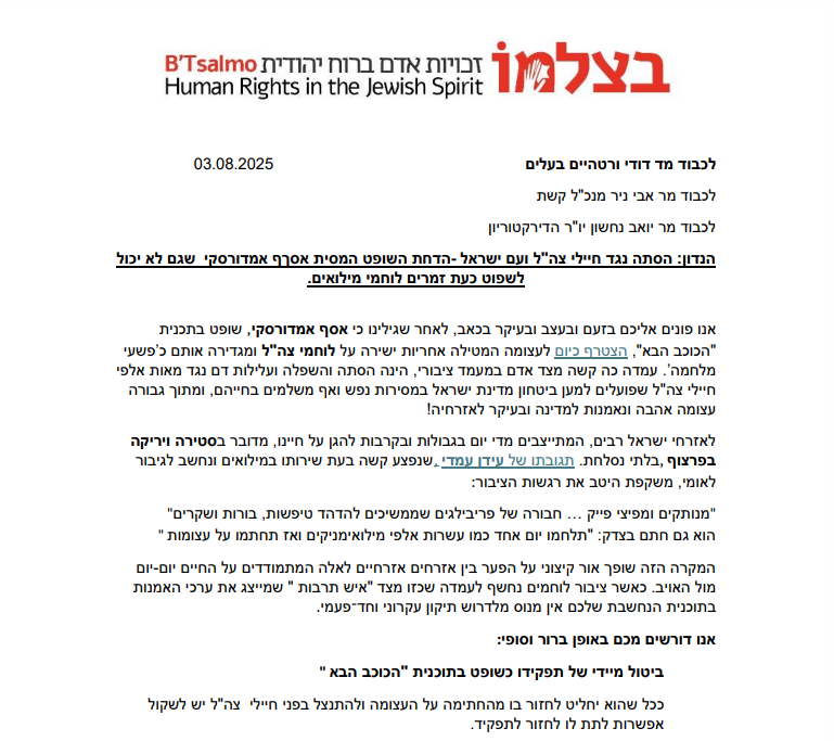 עוד נכתב: "אנו קוראים לכל מי ששותף לקביעת מדיניות זו והוצאתה לפועל – חדלו! אל תיתנו הוראות בלתי חוקיות, ואל תצייתו להן! אל תבצעו פשעי מלחמה! אל תזנחו את עקרונות המוסר האנושי ואת ערכי היהדות! מפסיקים את המלחמה. משחררים את החטופים. מוזמנים לחתום, להפיץ, לשתף. זה הזמן להשמיע את קולנו".