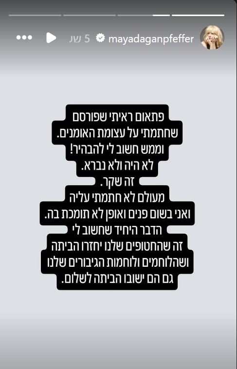 השחקנית מיה דגן שיתפה הערב (שלישי) כי נתקלה בדיווח שגוי על כך שהיא נמנית מחותמי העצומה וביקשה להבהיר כי מעולם לא עשתה זאת: "פתאום ראיתי שפורסם שחתמתי על עצומת האומנים. וממש חשוב לי להבהיר! לא היה ולא נברא. זה שקר. מעולם לא חתמתי עליה ואני בשום פנים ואופן לא תומכת בה. הדבר היחיד שחשוב לי זה שהחטופים שלנו יחזרו הביתה ושהלוחמים והלוחמות הגיבורים שלנו גם הם ישובו הביתה לשלום".