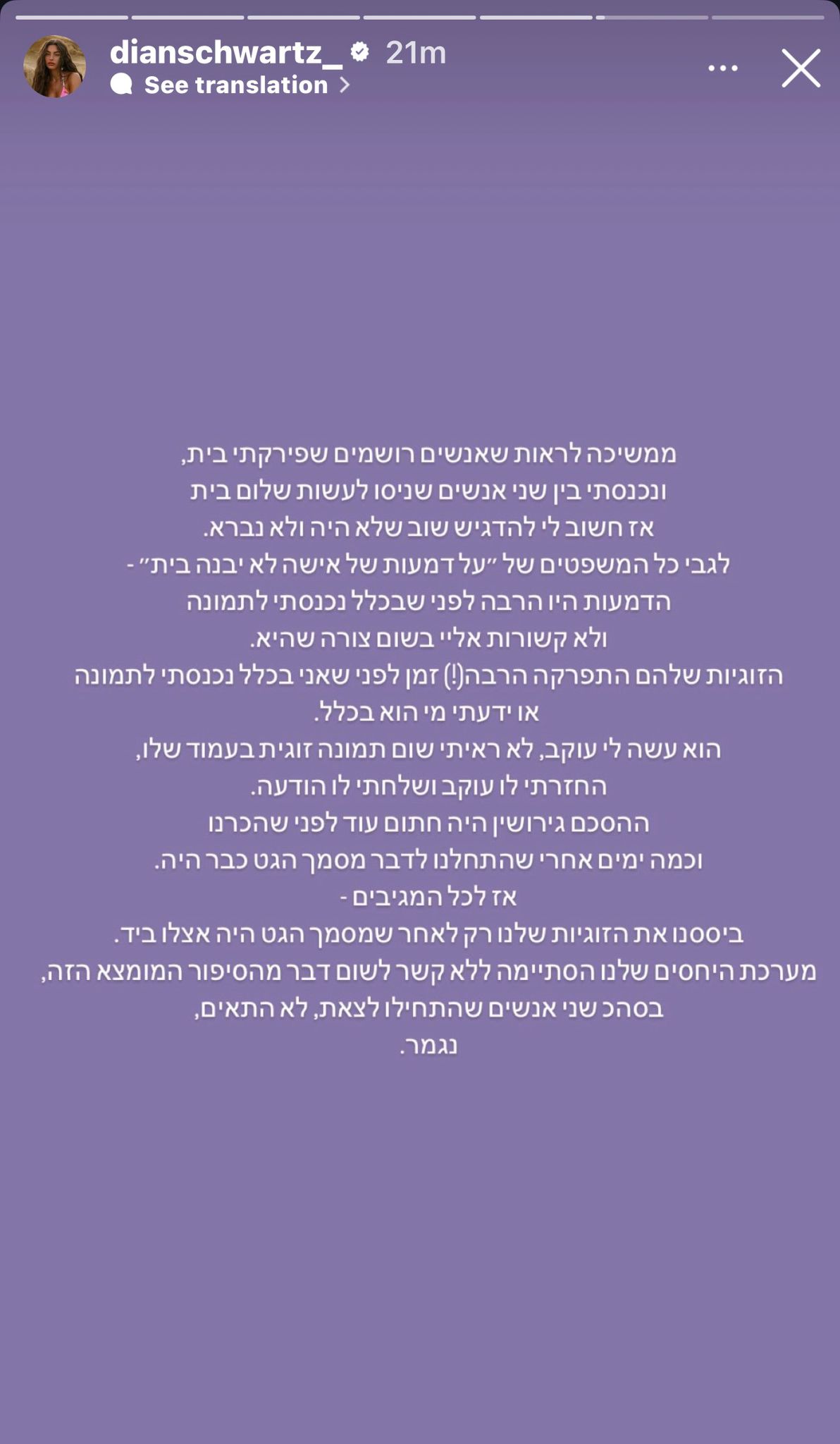 כוכבת הרשת דיאן שוורץ שפרצה לחיינו מבית "האח הגדול", חושפת את תחושותיה היום (ראשון) בסטורי בצל הפרידה מהאקס הגרוש דוד נידם, כאשר חשיפת הזוגיות בין השניים עוררה סערה בכל המדינה בטענה ששוורץ יוצאת עם גבר נשוי ומפרקת בית.