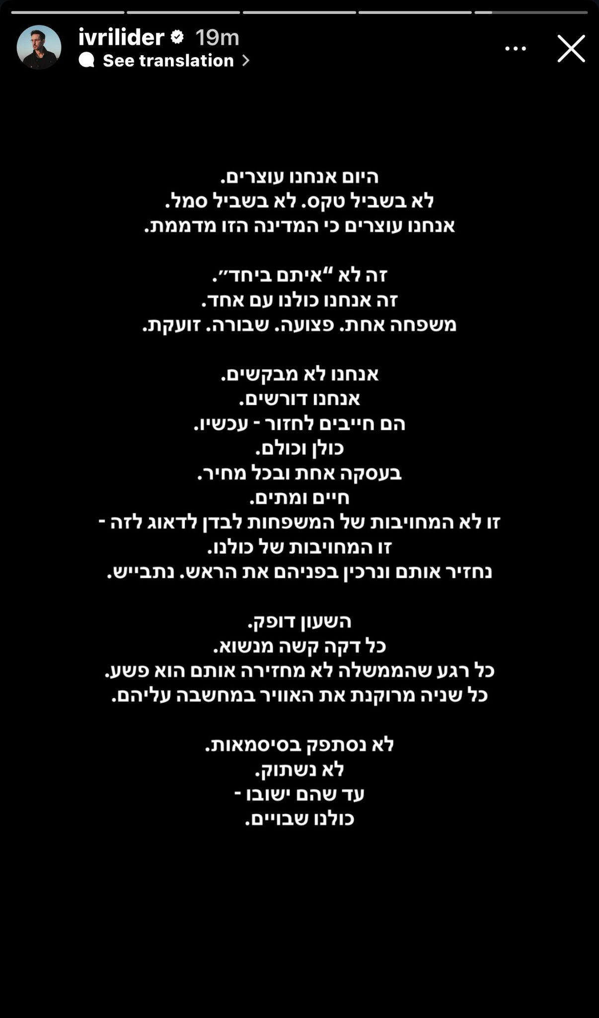 יום השביתה למען החטופים החל הבוקר (ראשון), בו אנשים רבים החליטו לא לעבוד ולצאת לרחוב, על מנת להפגין, שמור על אחדות הדדית ולהחזיר את החטופים הביתה. המוזיקאי עברי לידר שיתף בסטורי את תחושותיו, כך כתב: "היום אנחנו עוצרים, לא בשביל טקס, לא בשביל סמל, אנחנו עוצרים כי המדינה הזו מדממת".