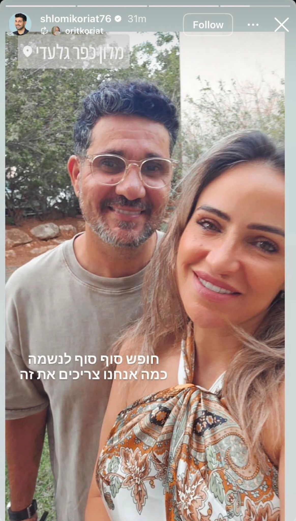 הזוג, שנמצא בימים אלו בעיצומו של שיפוץ ביתם בשכונת כפר גנים בפ"ת, בחר לקחת הפוגה מהשיפוצים ולהתפנק בחופשה רגועה בצפון הארץ. קוריאט העלה אתמול סטורי מכפר גלעדי וכתב: "חופש סוף סוף לנשמה. כמה אנחנו צרכים את זה".
