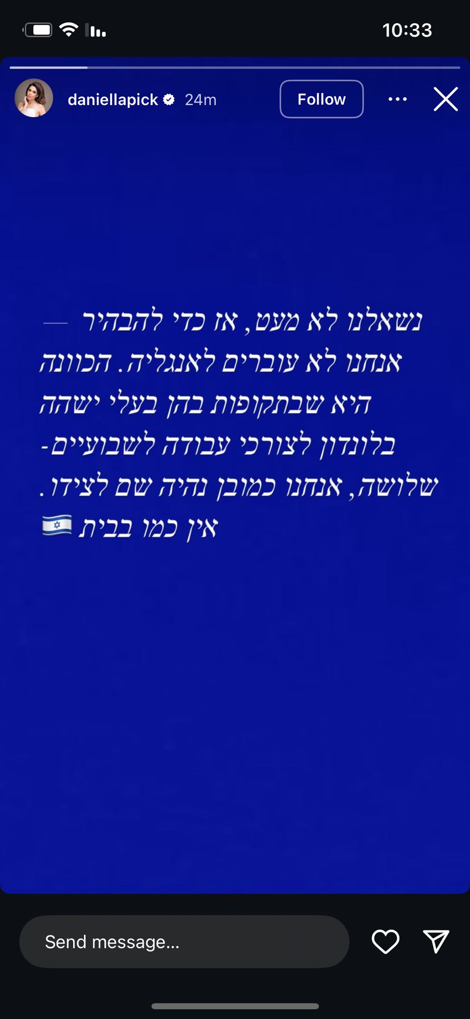 בסטורי שהעלתה פיק היא כתבה: "נשאלנו לא מעט, אז כדי להבהיר - אנחנו לא עוברים לאנגליה. הכוונה היא שבתקופות בהן בעלי ישהה בלונדון לצורכי עבודה לשבועיים, שלושה - אנחנו כמובן נהיה שם לצדו". לסיום חתמה לצד אימוג'י של דגל ישראל: "אין כמו בבית".