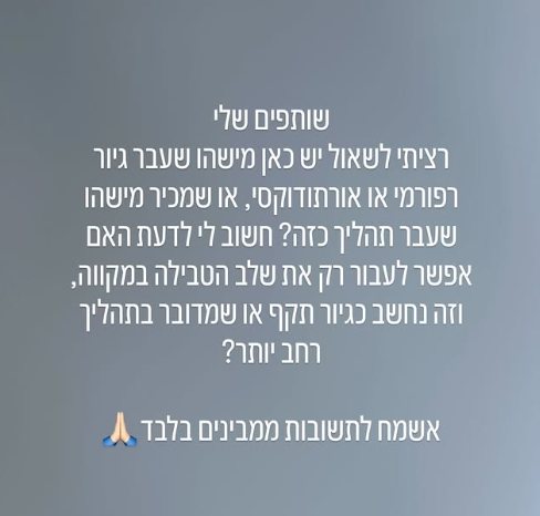 הוא ממשיך עם הסיבה לפנייה: "חשוב לי לדעת האם אפשר לעבור רק את שלב הטבילה במקווה, וזה נחשב כגיור תקף או שמדובר בתהליך רחב יותר?". לאחר מכן, כשנראה ששניר לא קיבל את התשובה שציפה לה, הוא חושף את ההתקדמות.