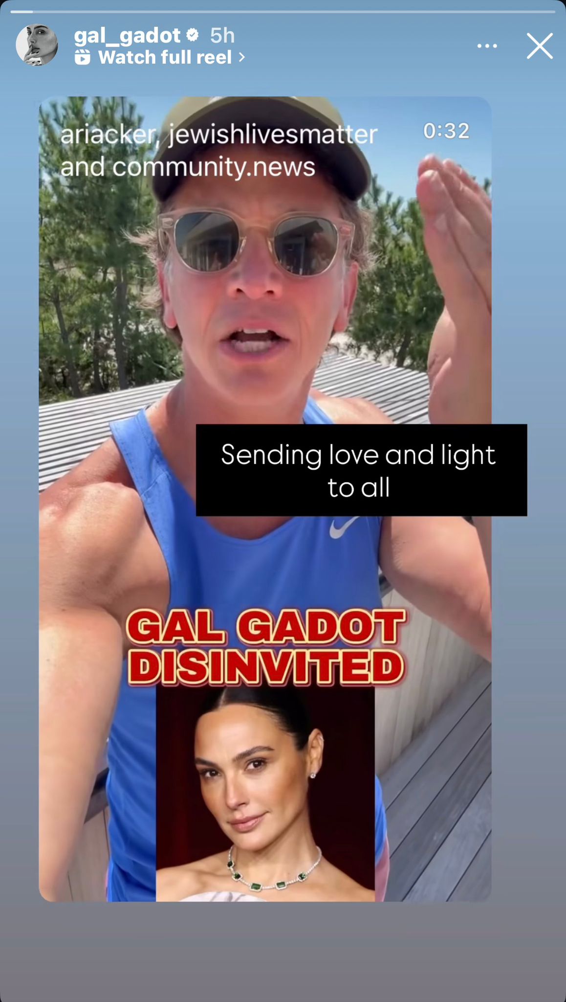 גדות החליטה לשבור שתיקה היום (רביעי) ולהגיב לראשונה בסטורי על החלטת ביטול השתתפותה בפסטיבל היוקרתי, כך כתבה: "שולחת אור ואהבה לכולם". זאת על גבי סרטון של יוצר התוכן הישראלי "ariacker" שאמר בסרטון: "גל האלופה אמרה שהיא בכלל לא התכוונה לקחת חלק בפסטיבל. שלא לדבר על כך שלסרט בהשתתפותה, 'בידיים של דנטה', אין שום קשר למזרח התיכון, אז הפשע שלה כאן הוא אך ורק היותה יהודייה וישראלית.