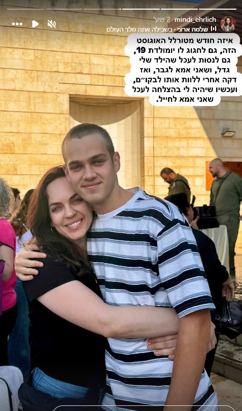 מינדי העלתה סטורי, אליו צירפה תמונה שלה מחובקת עם בנה נתי רגע לפני שהתחייל וכתבה ברקע: "איזה חודש מטורלל האוגוסט הזה. גם לחגוג לו יומולדת 19, גם לנסות להבין שהילד שלי גדל ואני אמא לגבר ואז דקה אחרי זה ללוות אותו לבקו"ם. ועכשיו שיהיה לי בהצלחה לעכל שאני אמא לחייל".