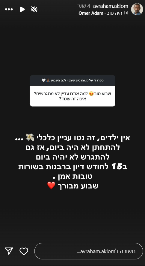 על כך, השיב אברהם אקלום: "אין ילדים, זה נטו עניין כלכלי. להתחתן לא היה ביום, אז גם להתגרש לא יהיה ביום. ב-15 לחודש יש דיון ברבנות. בשורות טובות אמן".