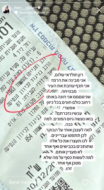כוכבת העונה האחרונה של "חתונה ממבט ראשון" בקשת 12, חן גולן, שהשידוך שלה לברק מור במסגרת התכנית לא נשא פרי, העלתה אתמול (ראשון) סטורי זועם לחשבון האינסטגרם שלה אחרי שקיבלה דו"ח חנייה מעיריית תל אביב.