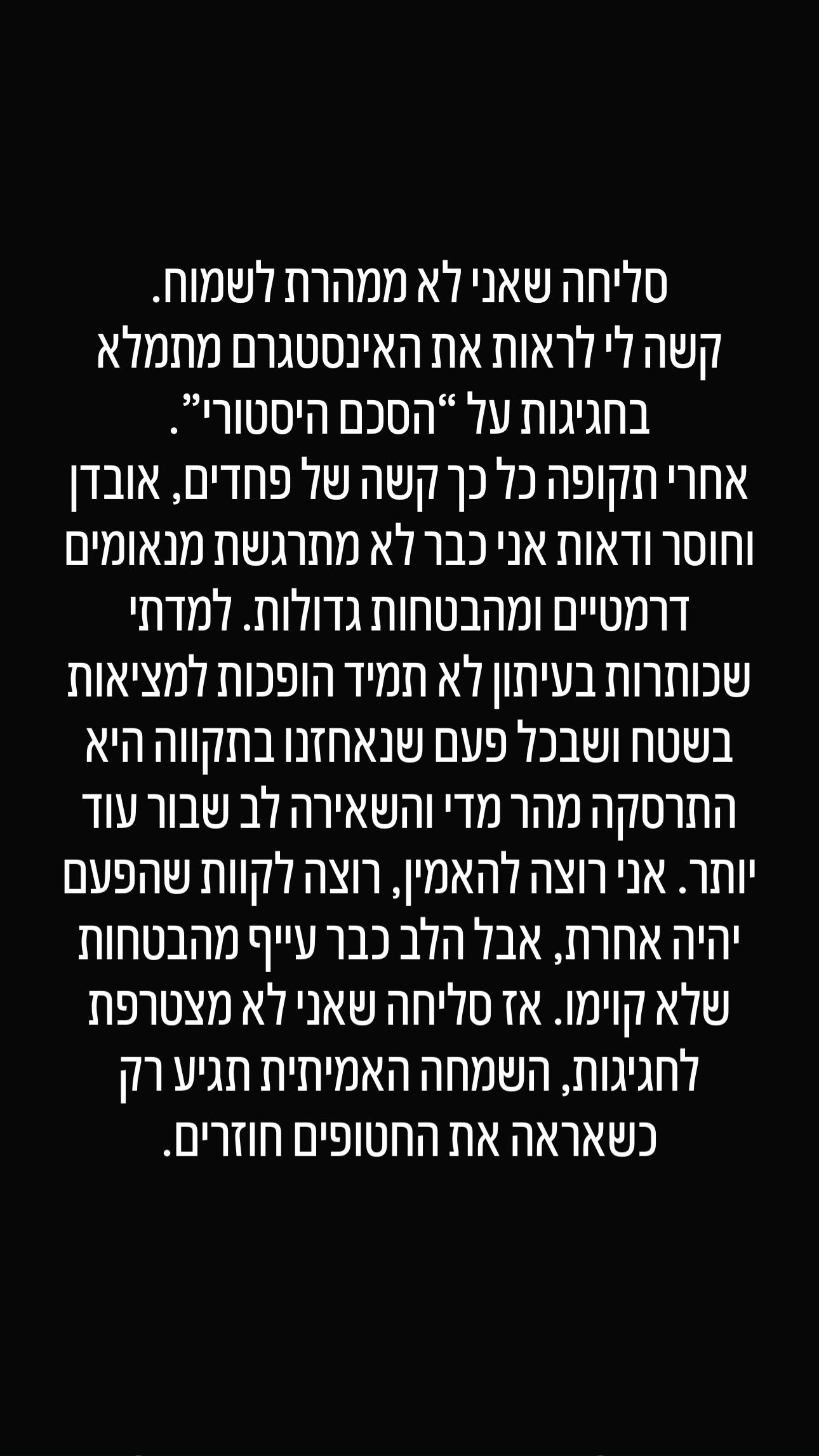 "סליחה שאני לא ממהרת לשמוח. קשה לי לראות את האינסטגרם מתמלא בחגיגות על 'הסכם היסטורי'. אחרי תקופה כל כך קשה של פחדים, אובדן וחוסר ודאות, אני כבר לא מתרגשת מנאומים דרמטיים ומהבטחות גדולות. למדתי שכותרות בעיתון לא תמיד הופכות למציאות בשטח ושבכל פעם שנאחזנו בתקווה, היא התרסקה מהר מדי והשאירה לב שבור עוד יותר", כך כתבה מאור ברוכמן לקהל העוקבים שלה.