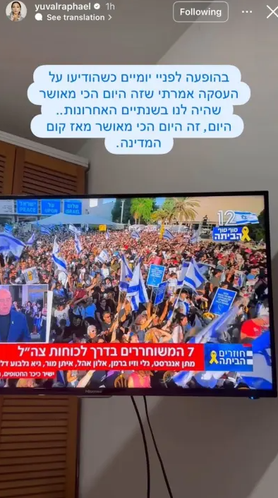 כעת, רפאל העלתה סטורי לחשבון האינסטגרם שלה, בו היא כתבה: "בהופעה שלי לפני יומיים כשהודיעו לי על העסקה, אמרתי שזה היום הכי מאושר שהיה לנו בשנתיים האחרונות. היום, זה היום הכי מאושר מאז קום המדינה".