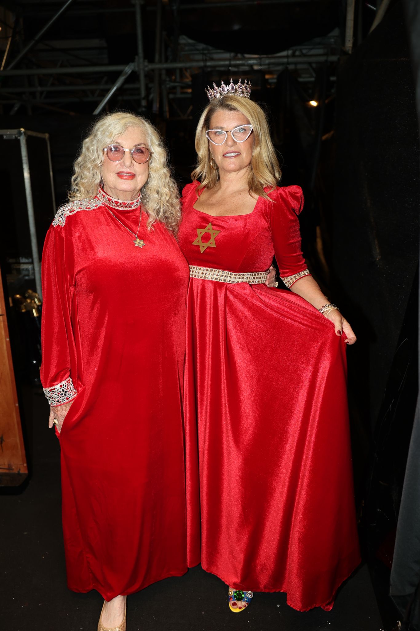 אלו הפרטים על הלוק של שרון אדם ואימא שלה אביבה שמר: השמלה נתפרה ממשי טהור בגוון אדום עמוק, סמל לעוז, תשוקה ונשיות עוצמתית, ומשולבת בפסי זהב מלכותי לאורך השוליים, הצווארון והמותניים - כסמל למלכות, קדושה והדר.