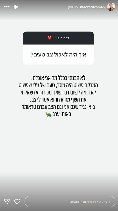 פליטת הריאליטי מספקת לא מעט הפתעות עבור קהל העוקבים שלה באינסטגרם. בסשן שאלות ותשובות שערכה עם מעריציה, סיפרה מאור ברוכמן על בעל החיים שאכלה בשוגג במסעדת יוקרה ביפן: "המרקם היה פשוט מוזר"
