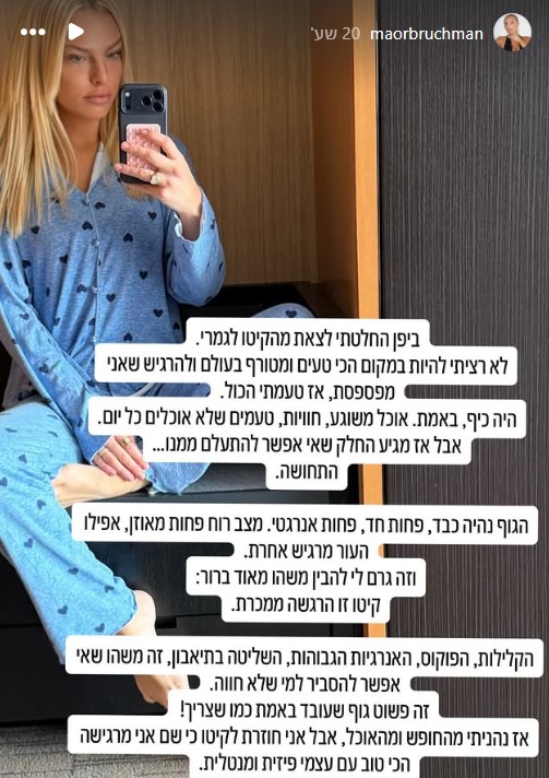 לאחר מכן, החלה כוכבת הריאליטי להבחין בהשפעה של שינוי הרגלי האכילה על גופה ועל מצב רוחה: "אבל אז מגיע החלק שאי אפשר להתעלם ממנו, התחושה. הגוף נהיה כבד, פחות חד ופחות אנרגטי. מצב רוח פחות מאוזן, אפילו העור מרגיש אחרת. זה גרם לי להבין משהו מאוד ברור: קיטו זו הרגשה ממכרת. הקלילות, הפוקוס, האנרגיות הגבוהות, השליטה בתיאבון, זה משהו שאי אפשר להסביר למי שלא חווה. זה פשוט גוף שעובד כמו שצריך. נהניתי מהחופש ומהאוכל, אבל אני חוזרת לקיטו כי שם אני מרגישה הכי טוב עם עצמי פיזית ומנטלית".